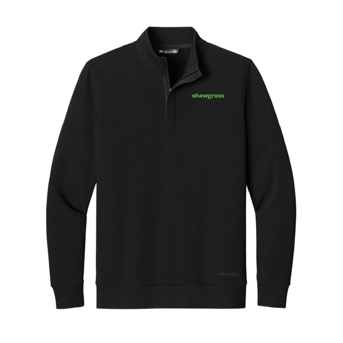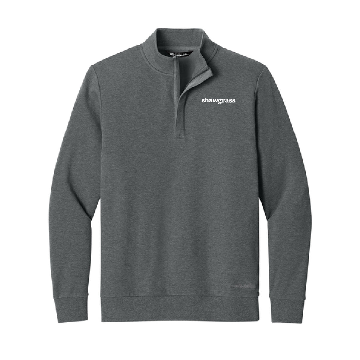 This men's TravisMathew ocean villa 1/2 zip comes in a black color, and a gray color. It features the Shawgrass logo.